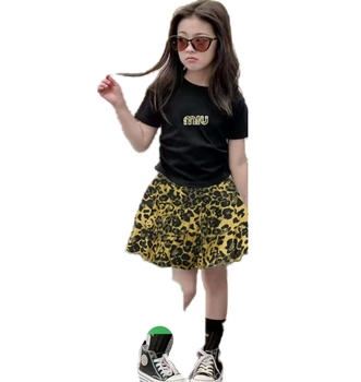 Camiseta con estampado de moda y falda de leopardo Conjunto de 2 piezas de verano para niñas