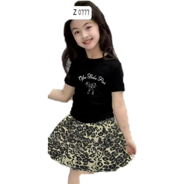 Camiseta con estampado de moda y falda de leopardo Conjunto de 2 piezas de verano para niñas
