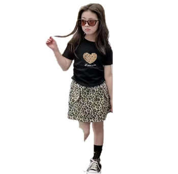 Moda Impressão Tee com Leopardo Saia Meninas Verão 2 Piece Set
